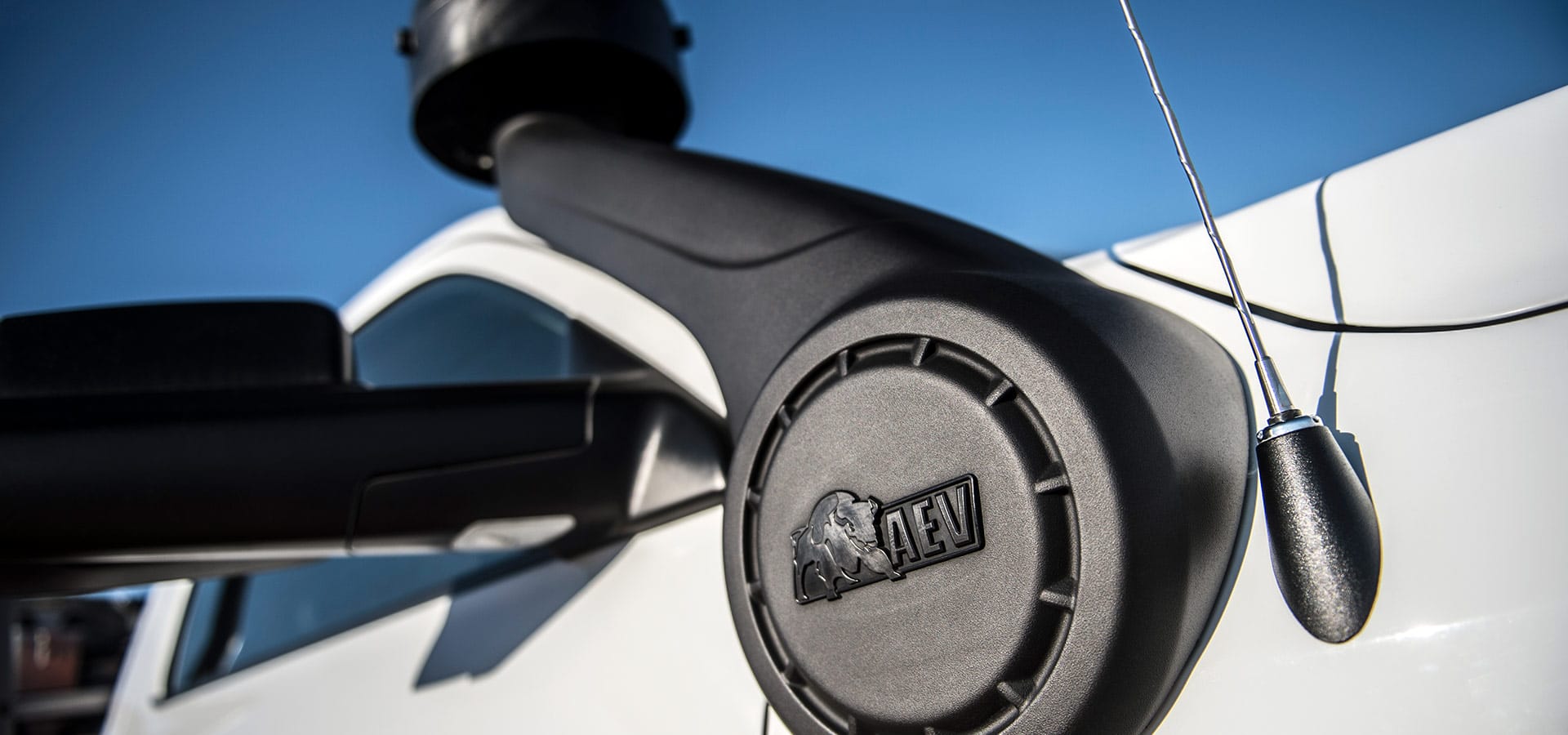 The AEV Snorkel System is available in two air inlet configurations—a traditional Air Ram or a High Efficiency Dust Filtration System. The High Dust Filtration System features a robust, self-cleaning design that is essential when traveling long distances through dusty terrain or idling for long periods of time on the construction site.